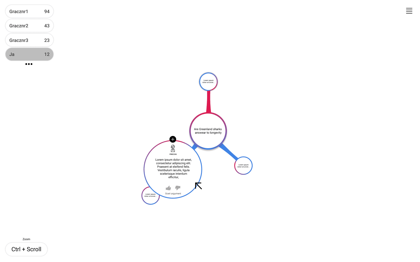 4CF leverages statistics and strategic foresight to analyze data and derive insights about various economic trends. To effectively communicate their findings, a tree-like graph structure was implemented. In the web application, experts collaborate by scoring each other’s responses on specific topics, with the graph and their inputs updating in real-time on the server. Following workshops, 4CF can export an SVG version of the entire discussion for presentation purposes.